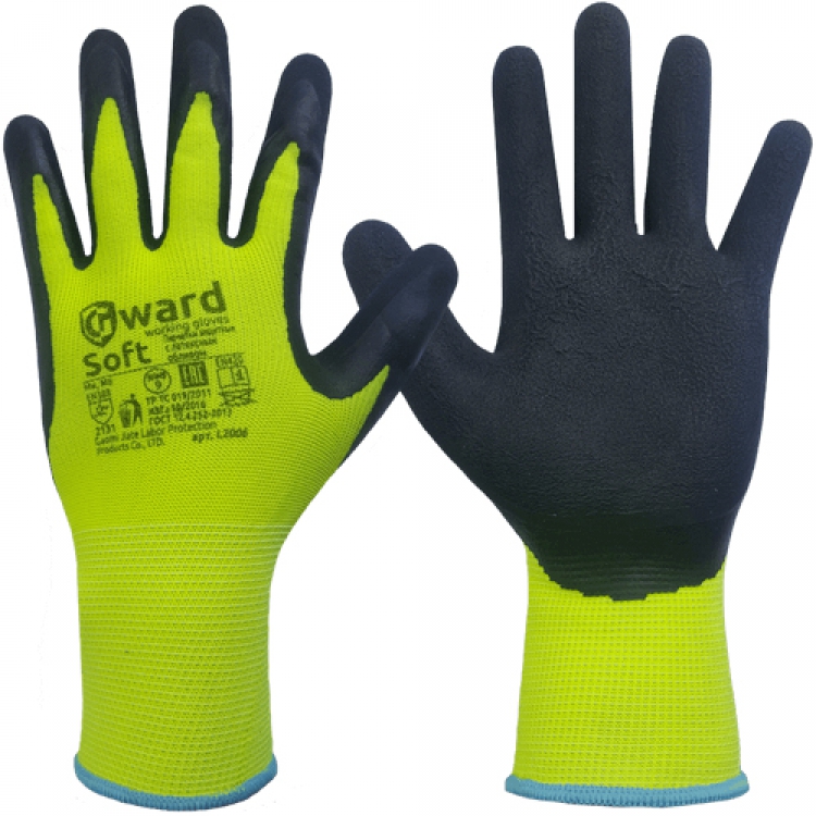 - В перчатках Gward Soft защитным покрытием является черный вспененный латекс. Он нанесен на область ладони и частично пальцев для предохранения от нежелательных порезов, проколов и других механических воздействий. Его микропористая структура обладает свойствами гашения небольших вибрационных нагрузок. Внешнее латексное покрытие позволяет крепко держать сухие и мокрые предметы, а за счет своей небольшой толщины не лишает руку тактильных ощущений.