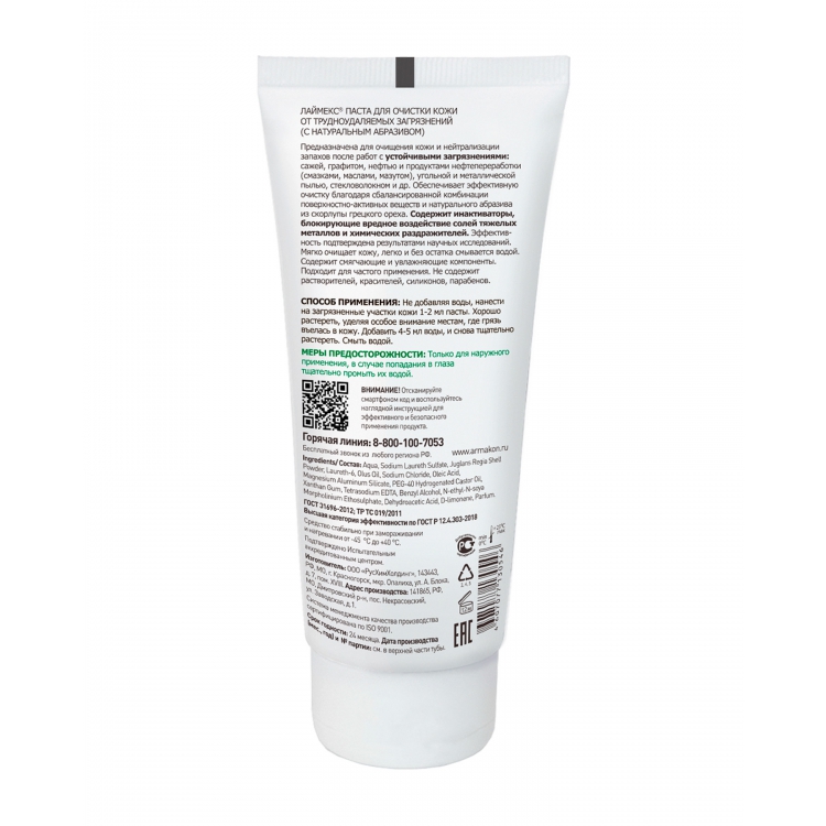 Паста ЛАЙМЕКС Армакон очищающая - эффективное средство для очистки кожных покровов от сложных производственных загрязнений и нейтрализации неприятных запахов. Подходит для ежедневного использования, хорошо смывается водой. Может быть использована на механосборочных участках, авторемонтных мастерских, предприятиях тяжелой промышленности.