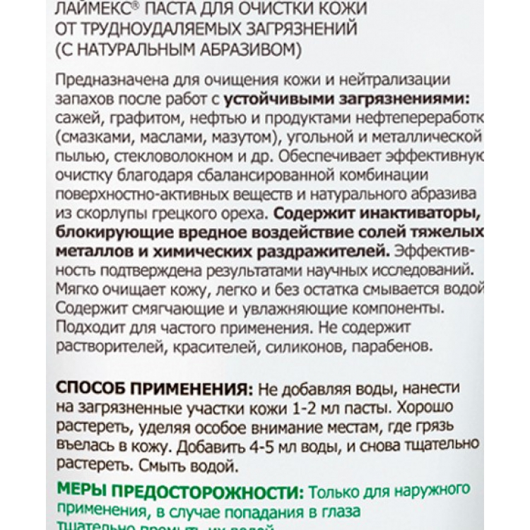 Благодаря натуральному абразиву из скорлупы грецкого ореха - ЛАЙМЕКС легко справляется со следами масел, бензинов, сажи, нефтепродуктов, битума и др.