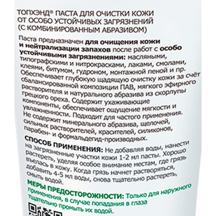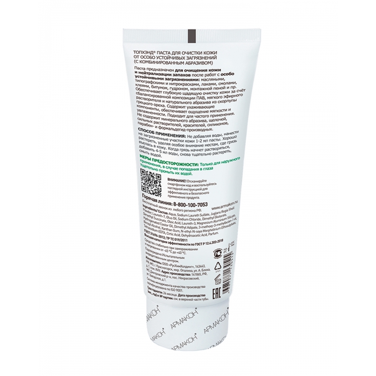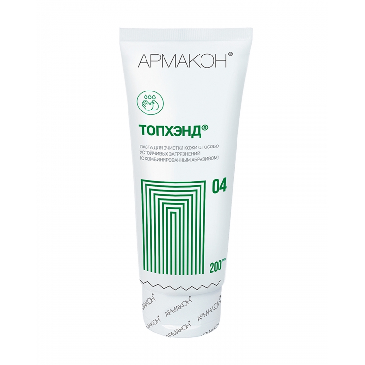 Паста ТОПХЭНД Армакон очищающая с комбинированным абразивом - эффективное средство с экономичным расходом для очистки кожных покровов от сложных производственных загрязнений и нейтрализации запахов. Средство имеет нейтральный рН, может использоваться ежедневно. Без кислот, щелочей, других агрессивных компонентов, красителей, силиконов, парабенов в своем составе.