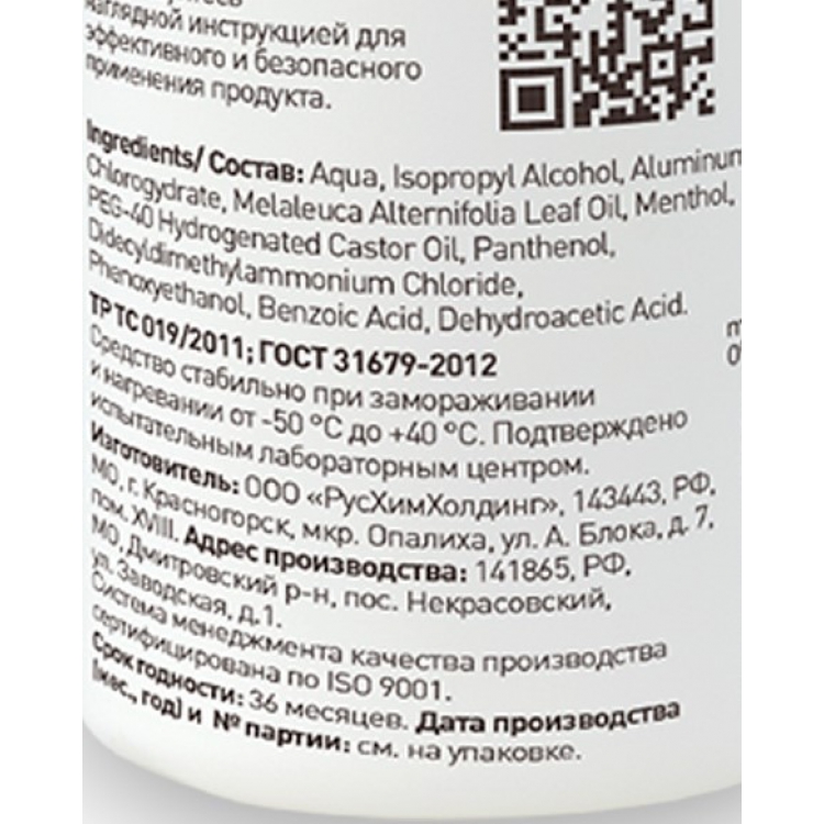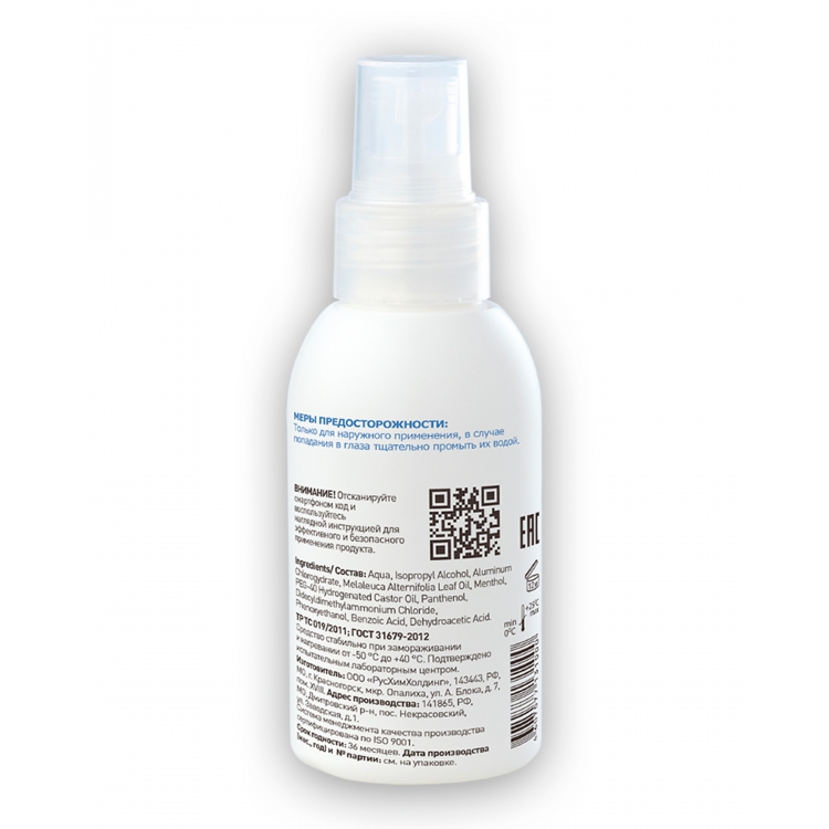 Спрей изготовлен и соответствует требованиям ГОСТ Р 31679-2012, что подтверждено декларацией о соответствия. Для эффективного использования его необходимо распылить с расстояния 15 см на чистые кожные покровы. Средство сохраняет дезодорирующий эффект продолжительное время, антимикробное действие в течение 3 часов. Возможно неоднократное применение в течение суток.