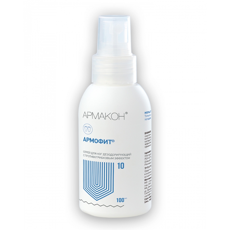 Спрей для ног АРМОФИТ Армакон противогрибковый -эффективное средство в борьбе с неприятным запахом пота, избыточным потоотделением, может быть использован для профилактики возникновения и развития грибковых заболеваний. Спрей для ног может быть использован как сотрудниками. чья работа сопряжена с длительной эксплуатацией защитной спецобуви, так и в быту.