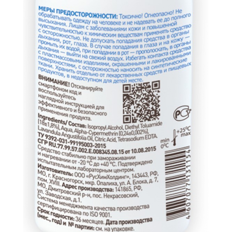 Репеллентные компоненты сдерживают подсадку и закрепление насекомых, блох, клещей на поверхность одежды; а акарицидный - влияет на их нервную систему, оказывая паралитическое действие. Спрей сохраняет эффективность при воздействии УФ-излучения и повышенной температуре.